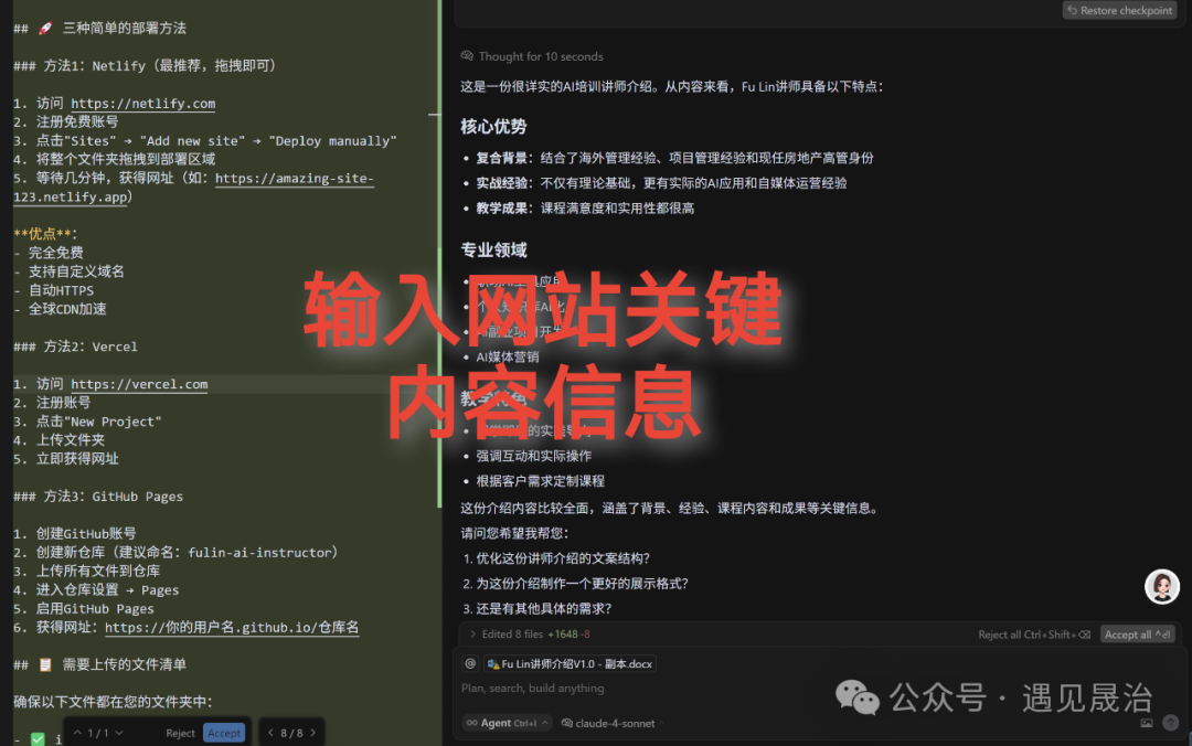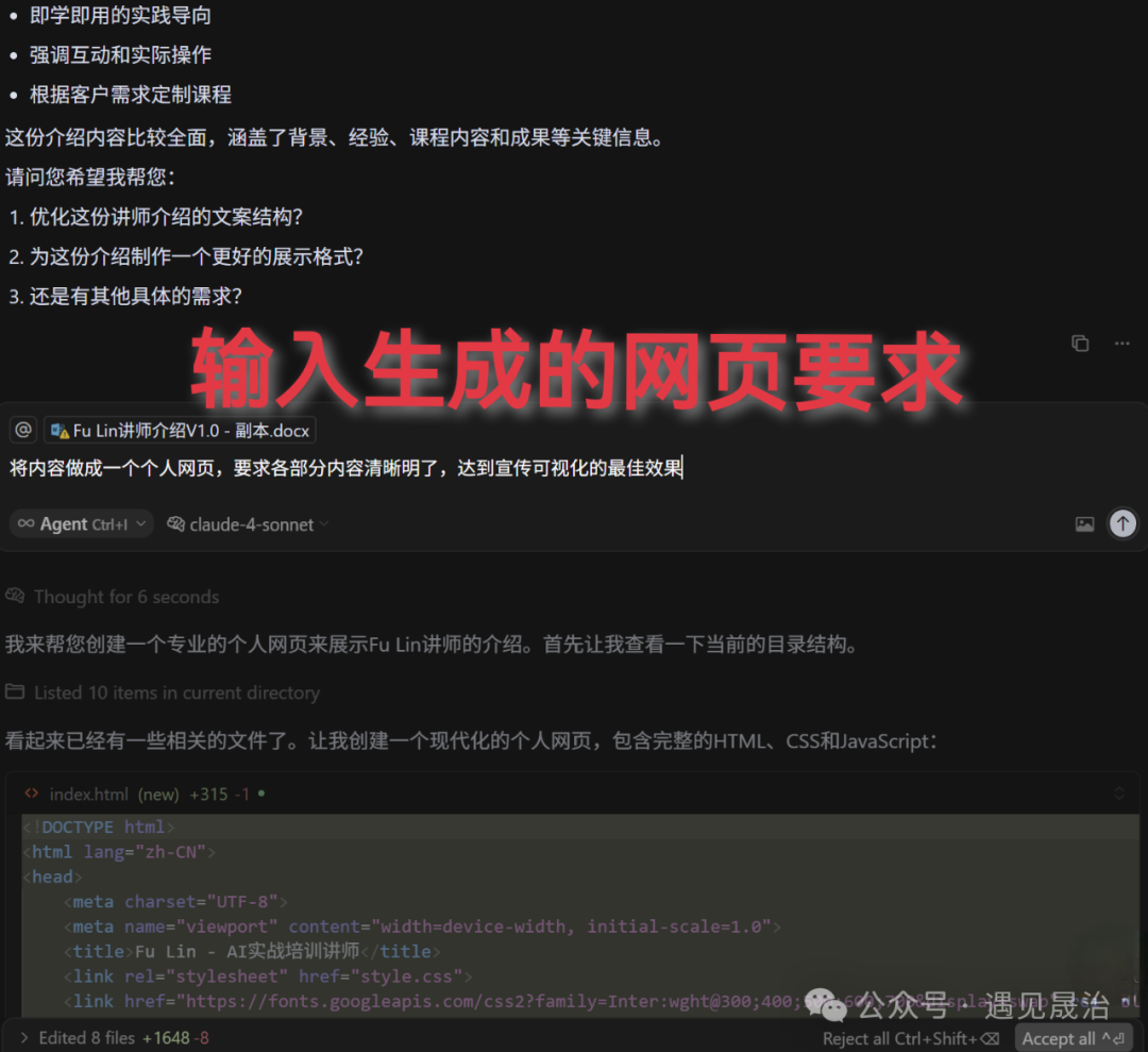 接着就打开cursor,把文档内容投喂给它,让它先过一遍整个文档,然后输入提示词:“将内容做成一个个人网页,要求各部分内容清晰明了,达到宣传可视化的最佳效果”,然后cursor就会一步步推演,到关键步骤时,它就会跟你确认,你点“accept(接受)”或者“run(运行)”即可。