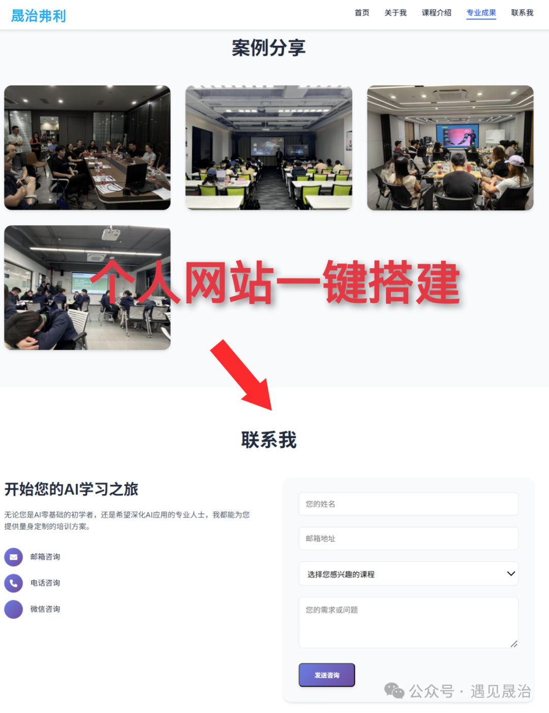 主页介绍、课程介绍、案例展示、联系方式、课程预约等界面,对于技术大咖来说不算啥,但对我这一小白来说,简直厉害到爆!