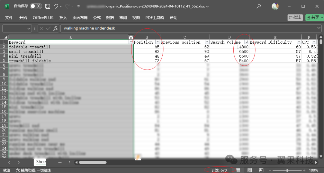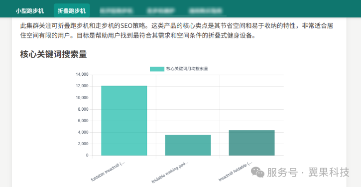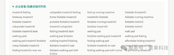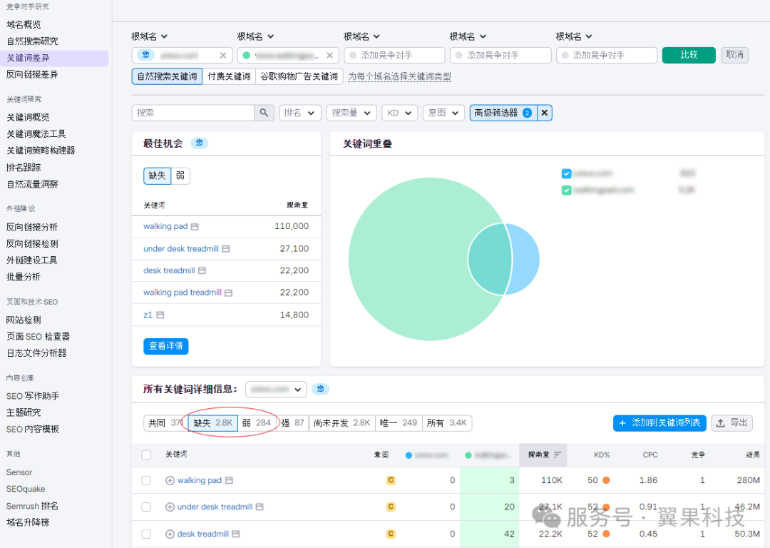 通过Semrush的关键词差异分析工具,我们清晰地看到了客户网站与主要竞争对手在关键词覆盖上的差距。在核心关键词层面,在排除双方品牌词及其相关关键词之后,我们与竞争对手共同的关键词只有371个,但我们缺失和弱势的关键词高达3000个!这意味着我们错失了大量的潜在流量。例如,“walking pad”、“under desk treadmill”和“desk treadmill”这些词,不仅搜索量巨大(分别为11万、2.71万、2.22万),而且竞争难度也相对适中,但网站当时全部缺失了这些词的排名。