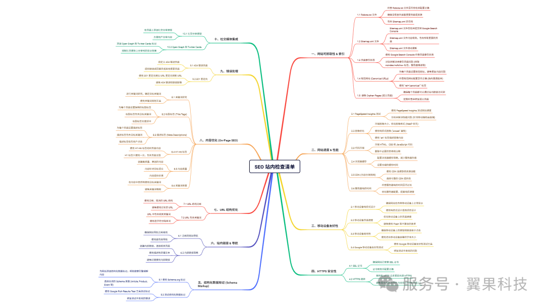 需要强调的是,内容优化远不止这些基础项。它还包括内容的原创性、深度、可读性、内部链接建设、用户体验(UX)优化等多个层面。我们在这里仅列举了最核心的基础优化点,但每一个细节都对网站的整体SEO表现起着至关重要的作用。完整的检查清单可以参考下面的思维导图,如果有不清楚的可以加我们客服微信咨询。