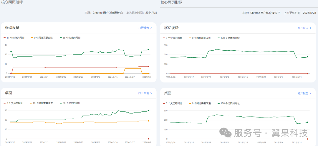 这些努力在 Google Search Console 的核心网页指标报告中得到了直观体现。对比优化前后(左图为优化前2024年4月8日的数据,右图为优化后的最新数据):