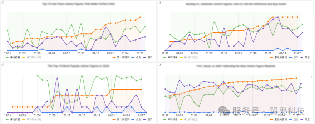 我们的系统会关注每个页面的曝光量、点击量和平均排名,以评估可见性和吸引力,同时分析用户的停留时长作为内容质量的关键指标;此外,我们还持续监控网站的累计出词量,以反映内容覆盖面和SEO能力的提升,从而优化表现并吸引更多潜在用户。